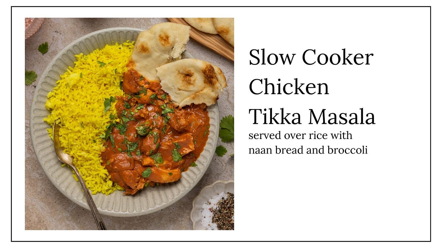 Leftovers of the Chicken Tikka Masala served over rice with broccoli and naan bread.